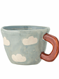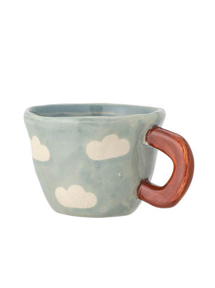 "made of stoneware, making it perfect for serving hot cocoa to little ones or espresso to adults. The cup is decorated in lovely colors, and the clouds create a dreamy and whimsical atmosphere that brings a smile to your face, even on rainy days."