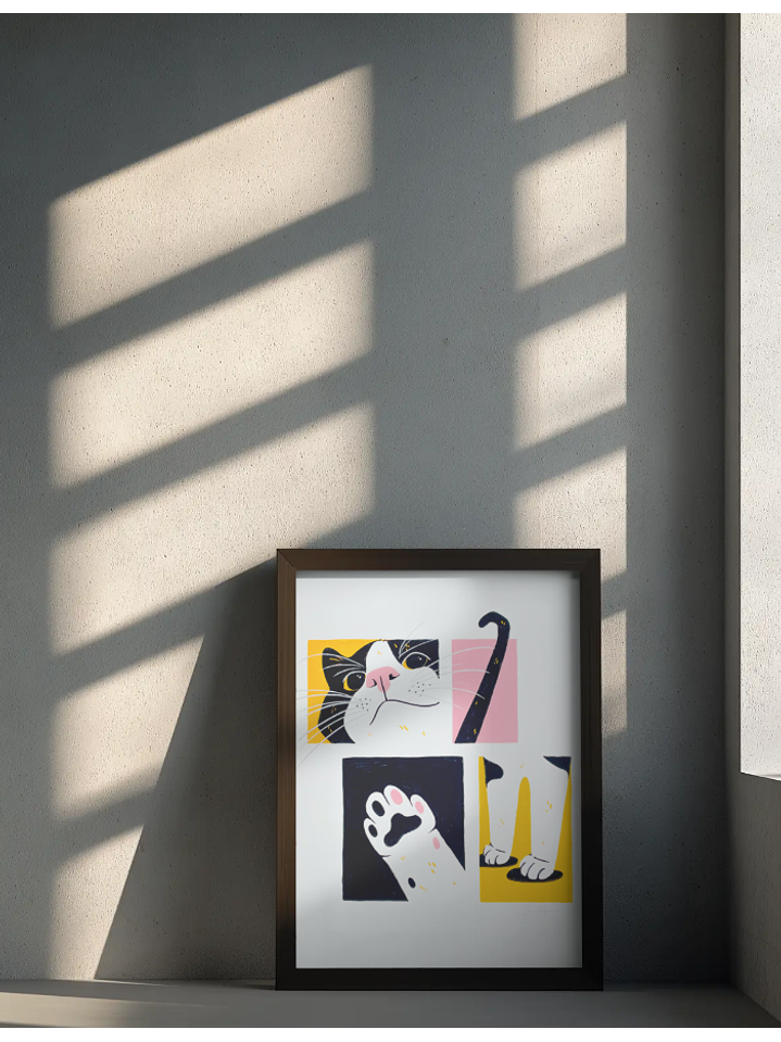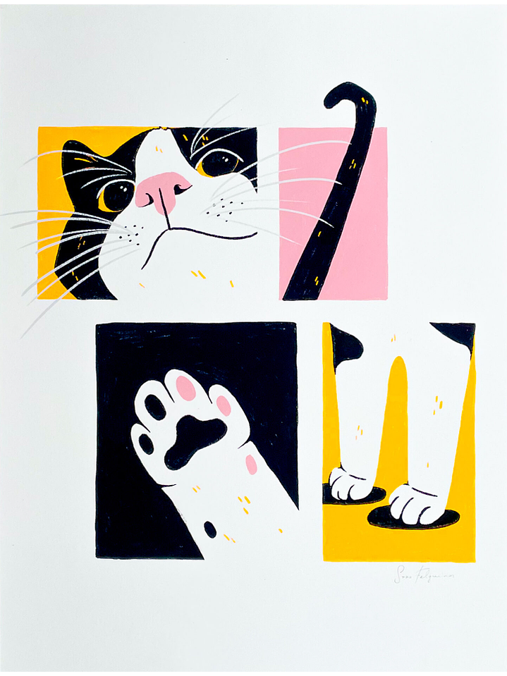 Esta obra representa diferentes momentos da vivência com um gato. Com a sua expectativa de vida mais curta, a sua perda, um dia, será inevitável. Num esforço inocente de contrariar o tempo incontrariável, valorizam-se os detalhes do presente e procura-se imortalizar esta vida em conjunto." Sara Felgueiras.