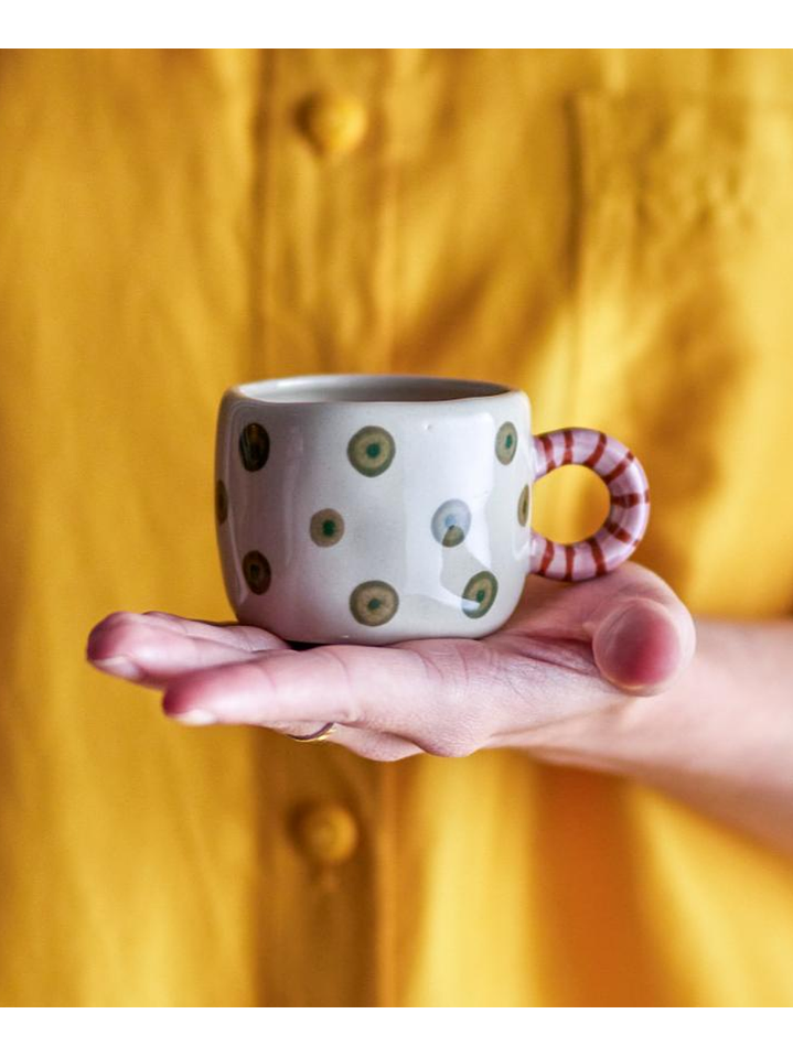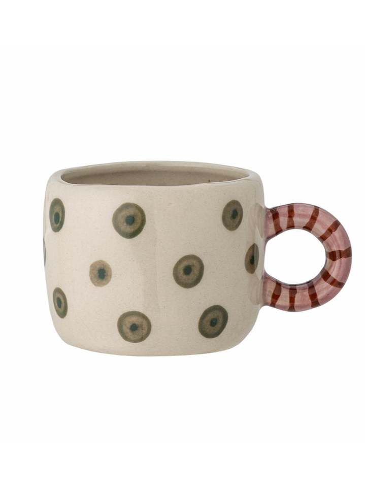 The Nini Cup by Bloomingville is made of stoneware and features a cute, hand-painted pattern. The cup is decorated with fine blue and white stripes, with a handle in deep pink. Its unique design makes it perfect for combining with other cups to create a fun and decorative collection. This charming cup is ideal for displaying on a mug shelf in the kitchen when not in use. The hand-painted details make each cup unique.